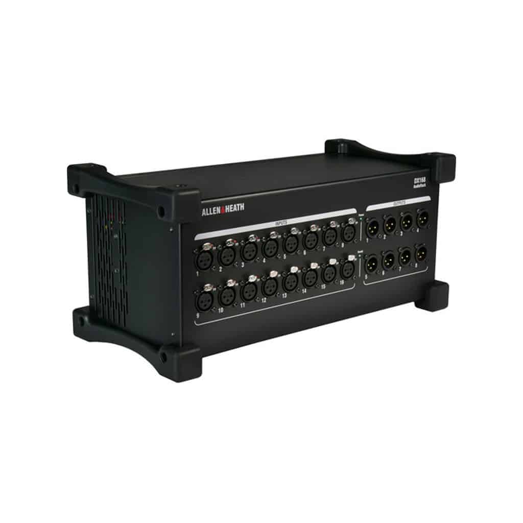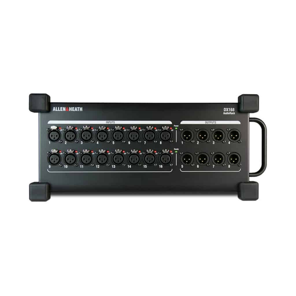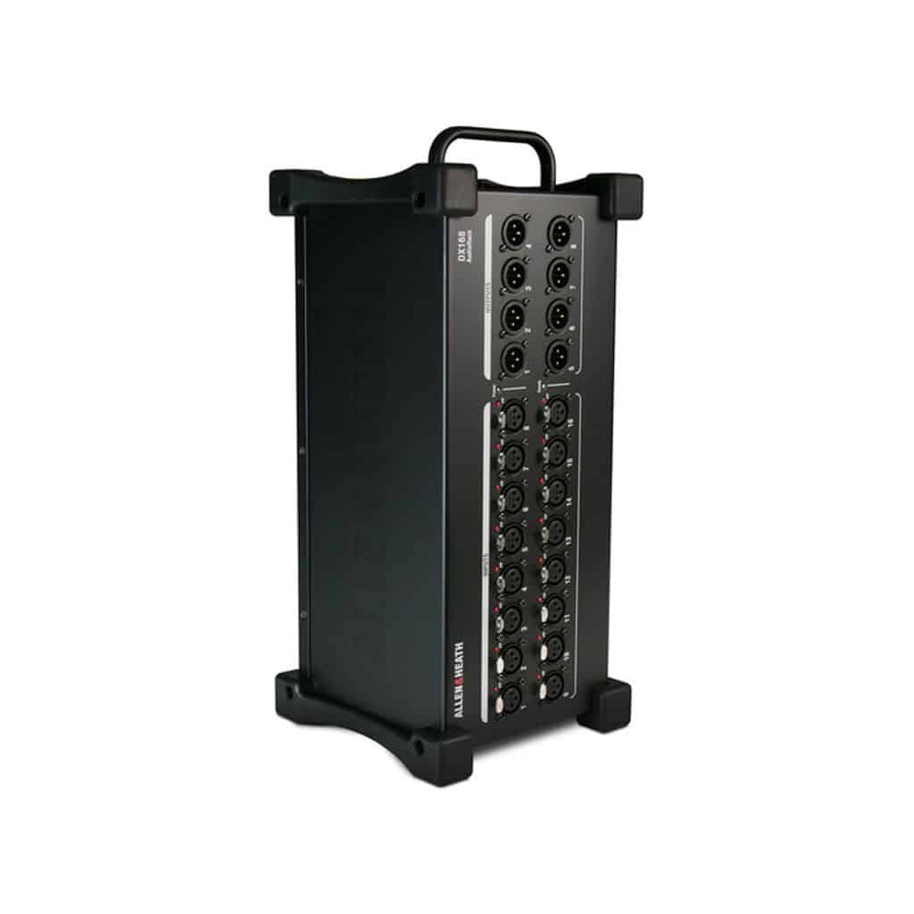 The rugged DX168ย Portable DX Expander from Allen & Heath adds remote inputs and outputs to the dLive S Class or C Class mixing systems. It features 16 XLR mic/line inputs, with independent phantom power LED indicators, along with eight XLR line outputs. The expander connects to the dLive system via a Cat 5 cable (sold separately), allowing for the inputs and outputs to be positioned up to 330′ away from the mixer.