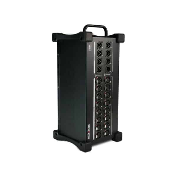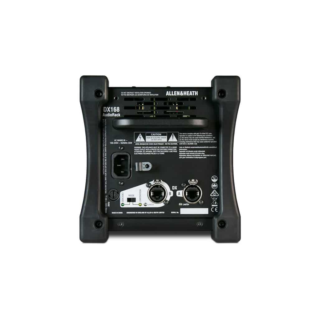 Up to six DX168 units can be added to a dLive system for a total of 96 inputs and 48 outputs, and Cascade mode allows daisy-chaining of two DX168 expanders for additional inputs and outputs. The sturdy and versatile design of the expander and hard-wearing rubber bumpers allow it to be placed directly on the stage floor during performances or rack-mounted in a standard 19″ rack or case (requires a remote audio rack kitโsold separately). It also comes with a carry handle for convenience and portability.