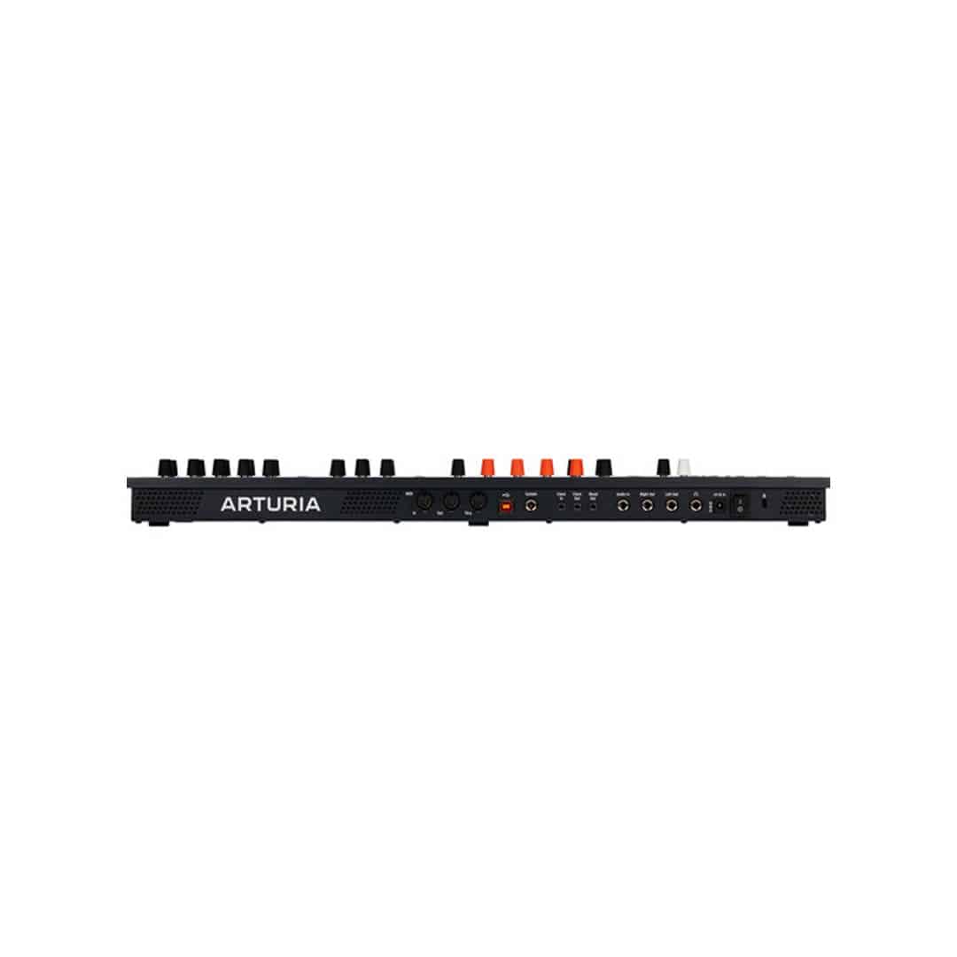 MIDI in/out/thru, USB connectivity, sustain, audio in, and clock in/out connectivity, stereo outputs