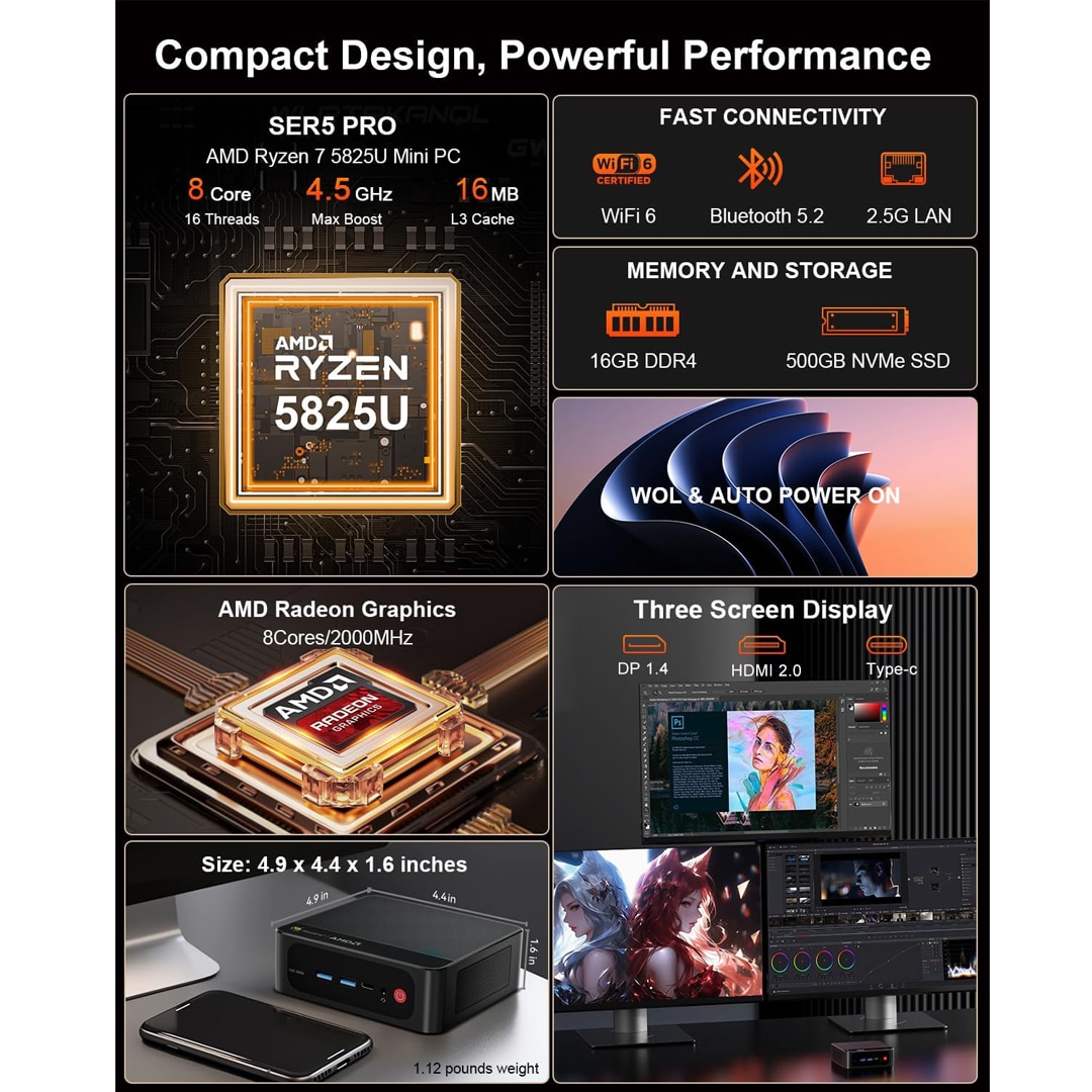 The Beelink SER5 Pro Mini PC is a compact desktop solution designed for productivity, creativity, and entertainment. Powered by the AMD Ryzen 7 5825U processor with 8 cores and 16 threads (up to 4.5GHz), this mini computer delivers outstanding performance for office work, streaming, content creation, and even light gaming. With 16GB DDR4 RAM, a 500GB PCIe SSD, and AMD Radeon Graphics, the SER5 Pro ensures smooth multitasking, fast load times, and sharp 4K visuals. Its small form factor makes it perfect for home, school, or business use.