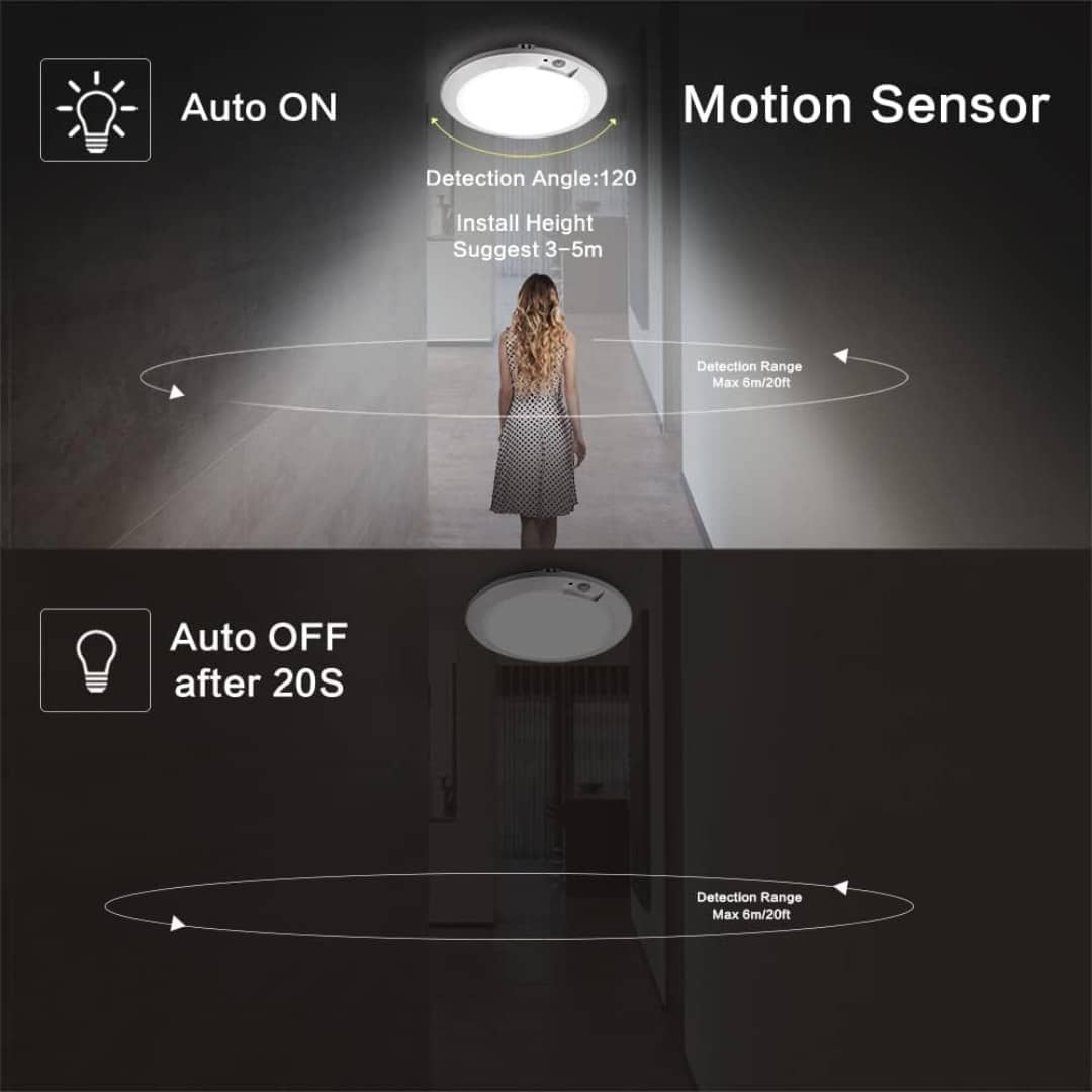 - Smart Motion & Light Sensor โ Detects motion within 20 ft and turns off automatically after 20 seconds of no activity. Works only in dark environments to save energy.