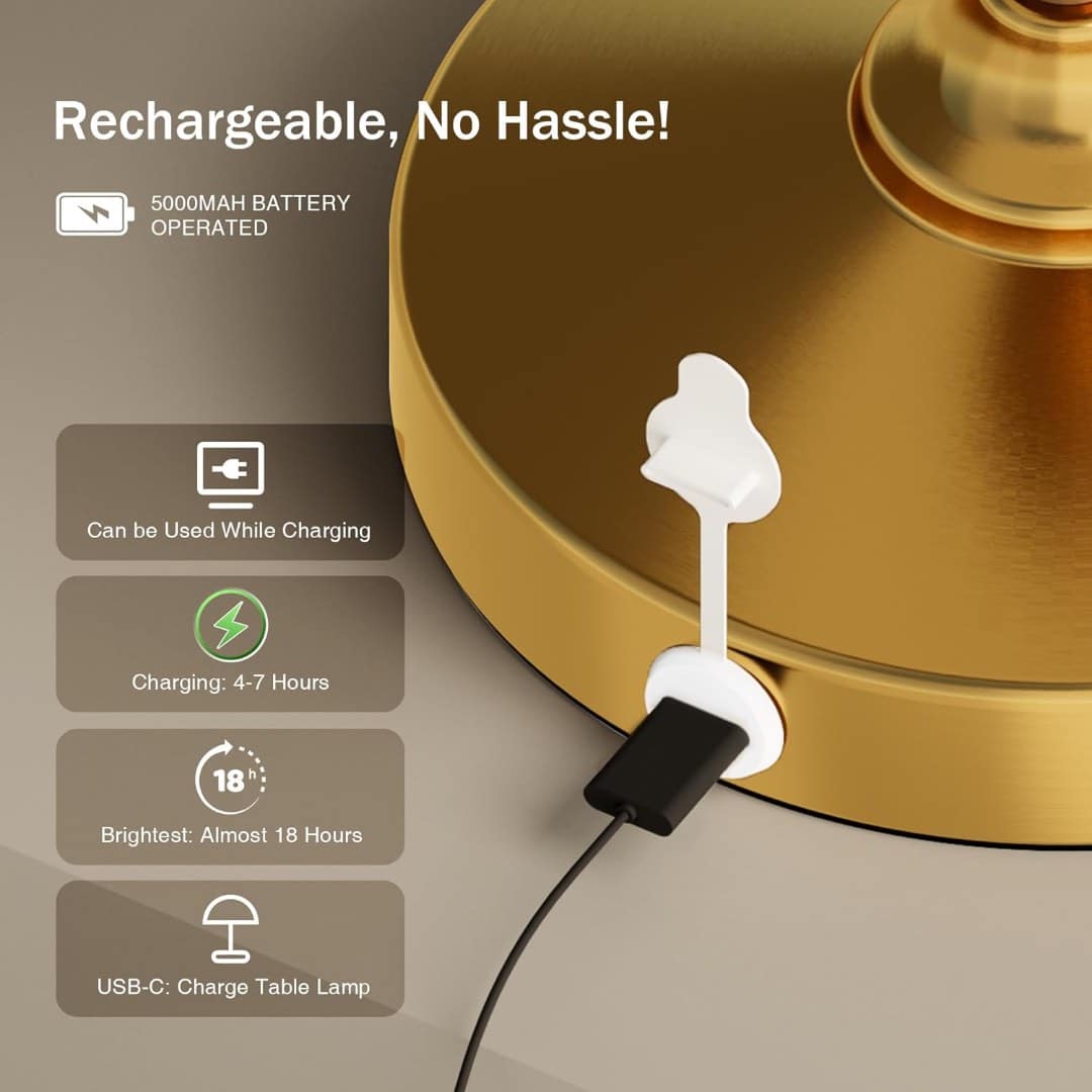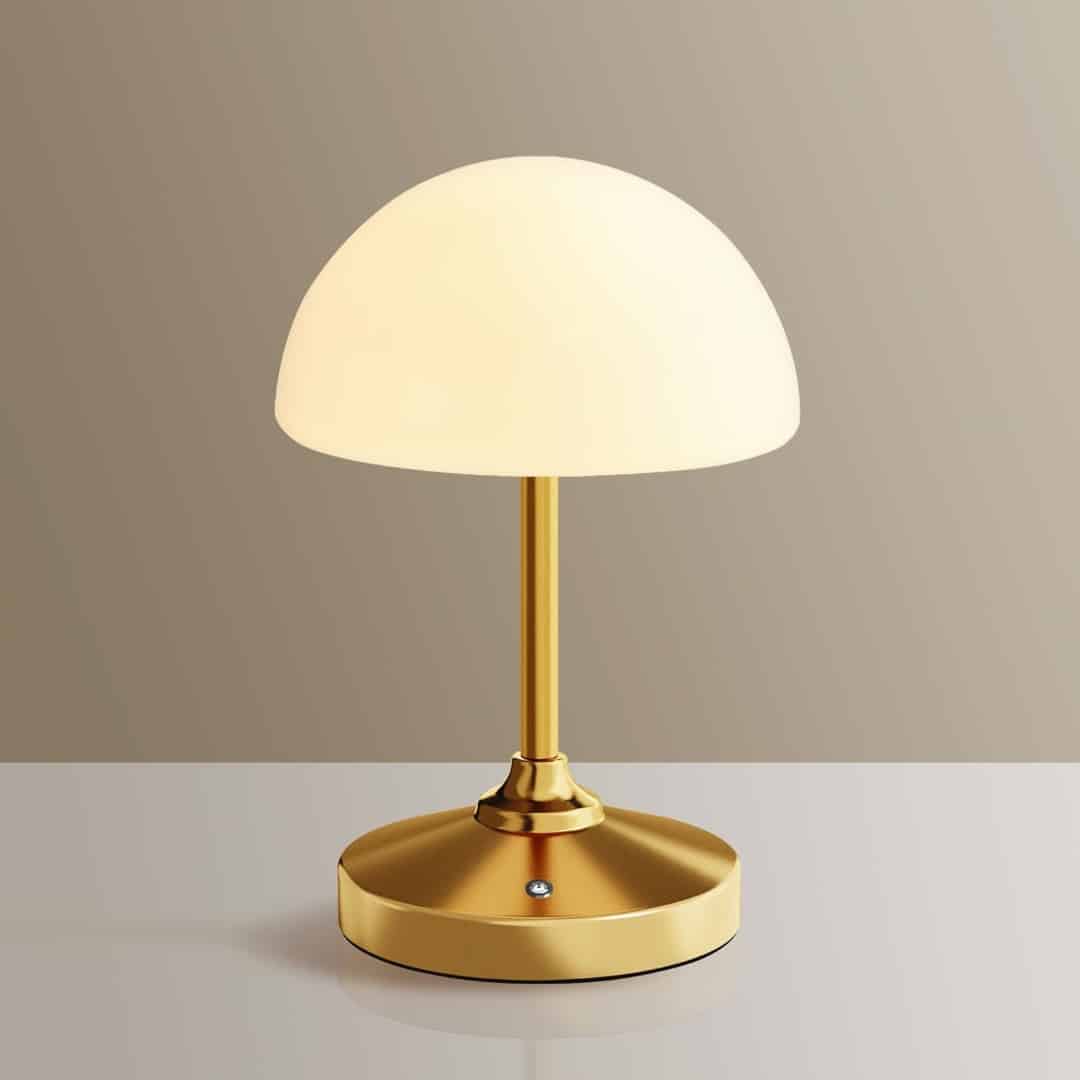 Add style and convenience to your home or outdoor spaces with the Dawnwake Mushroom Table Lamp. Featuring a sleek modern design with a golden iron base and a white glass shade, this portable lamp combines elegant looks with practical functionality. Its cordless rechargeable design makes it easy to place anywhere without messy wires, while the warm glow creates a cozy and romantic atmosphere indoors or outdoors.