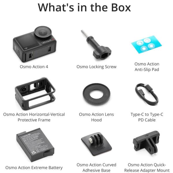 - Includes DJI Osmo Action 4, 1 battery, 1 Quick-Release Adapter Mount, and more. This combo is a great introductory choice for first-time action camera users looking to get 4K footage.