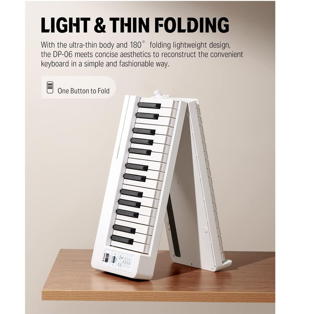 The Donner DP-06 is a portable, foldable digital piano designed for beginners and travelers who want the experience of playing anywhere. With a lightweight body, foldable design, and semi-weighted keys, it offers both convenience and playability. Its built-in battery provides up to 10 hours of use, making it ideal for practice sessions, performances, or travel. Equipped with Bluetooth connectivity, multiple tones, rhythms, and demo songs, the DP-06 is a versatile instrument for learning and creativity.