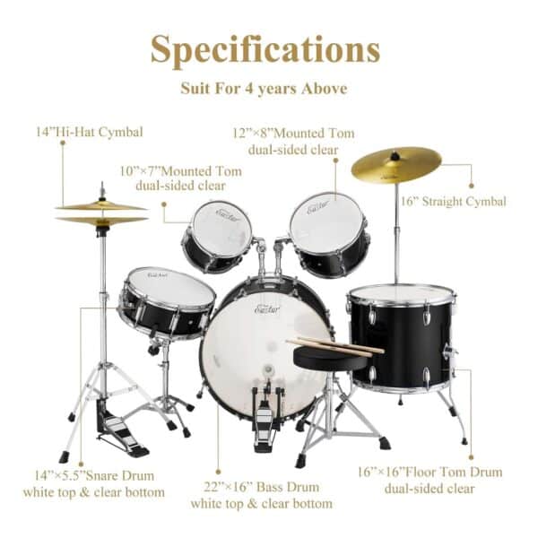 Unleash your rhythm with the Eastar 22″ 5-piece full-size drum set, designed for adults and beginners alike. Built with durable hardware, crisp cymbals, and a bold mirror black finish, this kit delivers powerful sound and a complete drumming experience right out of the box.