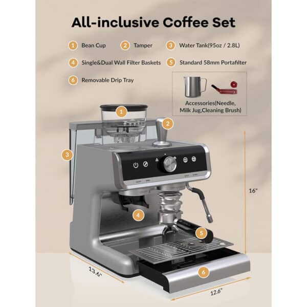 GarveeHome Espresso Machine with Grinder & Milk Frother โ 95 oz Water Reservoir, PID Control
