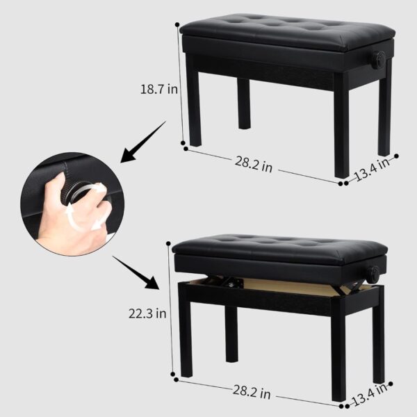 The Jdfdexc Adjustable Double/Duet Piano Bench combines comfort, durability, and functionality, making it an excellent choice for pianists of all levels. Built from solid wood with a sturdy frame, this heavy-duty bench provides stable support and long-lasting use. The cushioned seat is filled with high-density sponge and upholstered in waterproof artificial leather for a soft, durable, and easy-to-clean finish. Equipped with dual side paddles and an effective lifting mechanism, the bench allows smooth height adjustment to ensure the perfect playing position. A spacious hidden compartment beneath the seat provides convenient storage for sheet music and books, while the non-slip rubber pads at the base protect floors and enhance stability. Its sleek black design and glossy finish complement any piano or home interior, making it both a practical and stylish addition.