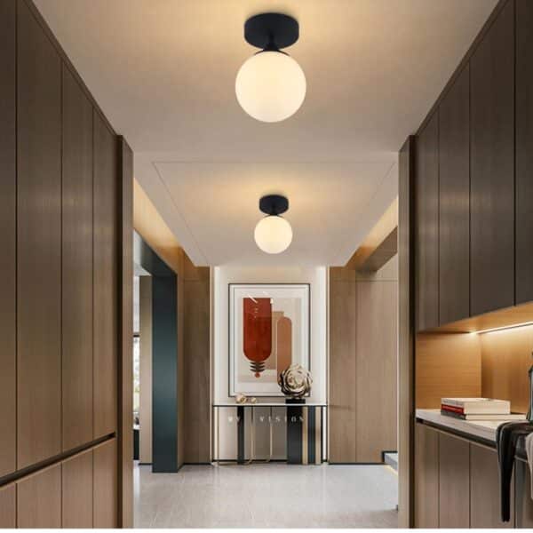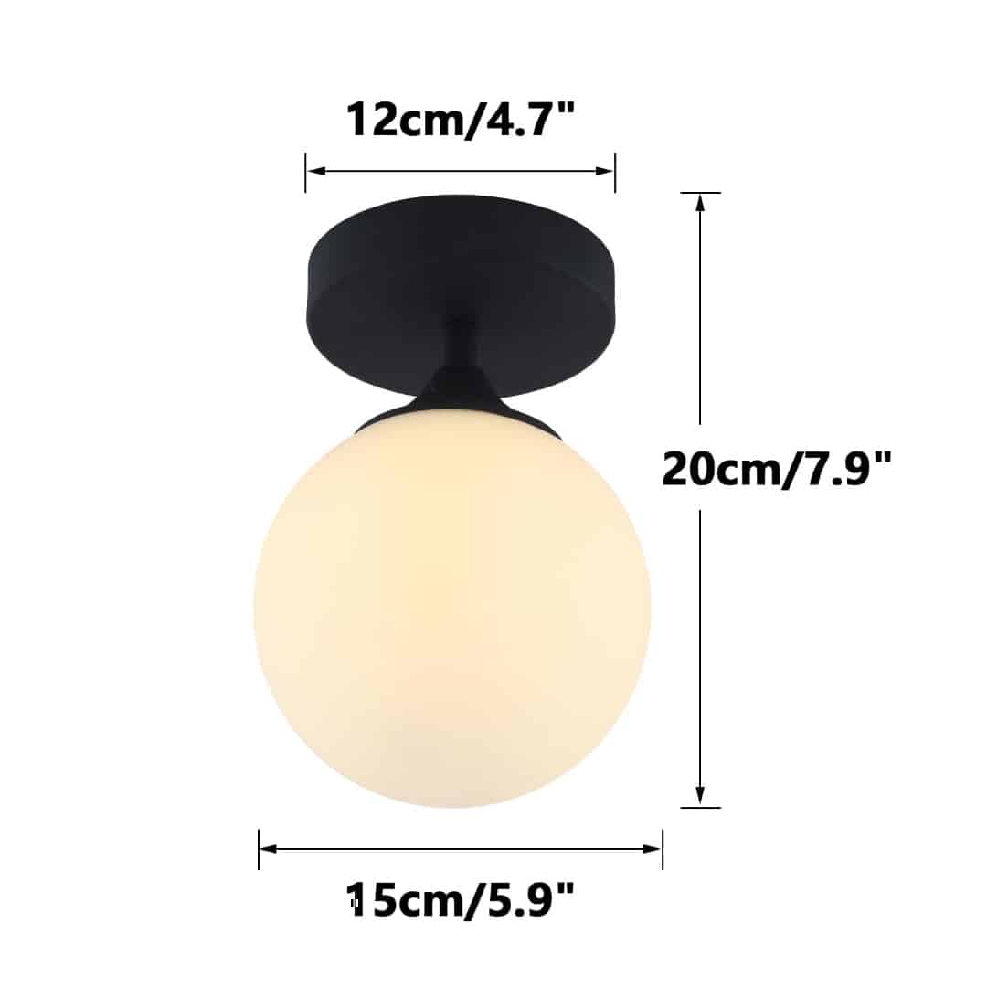 - Stylish black metal finish with white frosted glass globe for soft, diffused lighting.