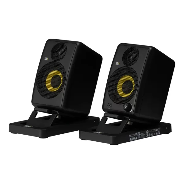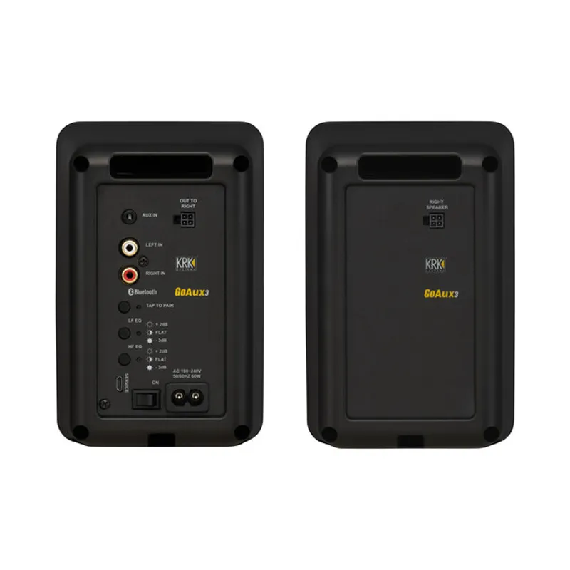 The KRK GoAux 3 portable nearfield monitors are designed to provide great sound anywhere you go. The perfect monitors for traveling musicians and engineers, they deliver renowned KRK sound quality in a mobile-friendly size. Since theyโre made to go wherever you do, the GoAux 3 monitors come with a convenient nylon carrying bag that holds both monitors as well as the included monitor stands and any extra cables you want to take along with you. The stands are adjustable for the optimum monitoring positioning and angle. The GoAux 3 monitors pair a 3โ glass aramid woofer with a 1โ soft textile dome tweeter in a 60 W RMS (total system power) bi-amplified two-way design. The rear-ported ABS cabinets are durable and supply surprising bass extension for a portable speaker. With the power amps located in one speakerโs housing and the second speaker powered through an included speaker-level connection from the first, the pair only needs a single AC outlet for operation. Built-in LF and HF EQ let you adjust the monitorsโ response to the room and your personal preferences. Along with the 1/8โ Aux and RCA stereo inputs, Bluetooth capability means you can connect wirelessly to your smartphone, computer, or other Bluetooth-capable audio devices. When you need to monitor silently, you can connect to the front panel 1/8โ stereo headphone output, which automatically mutes the GoAux 3 speakers.