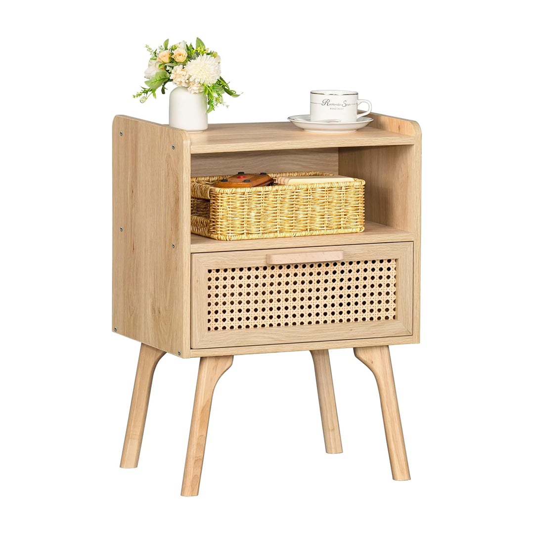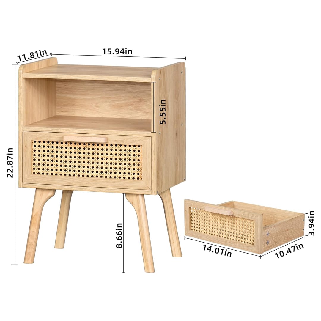 - Smart Storage โ Features a spacious tabletop, a breathable rattan drawer, and an open lower shelf to hold your bedtime essentials, books, or decor.