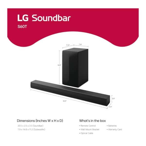 Experience next-level audio with the LG S60T, a sleek 3.1 channel soundbar designed to bring cinematic sound straight into your living room. With powerful Dolby Audio, seamless TV Synergy, and smart AI Sound Pro, this soundbar delivers rich clarity, deep bass, and immersive sound for movies, music, and gaming. Modern and minimal, it blends into any setup while maximizing your entertainment experience.