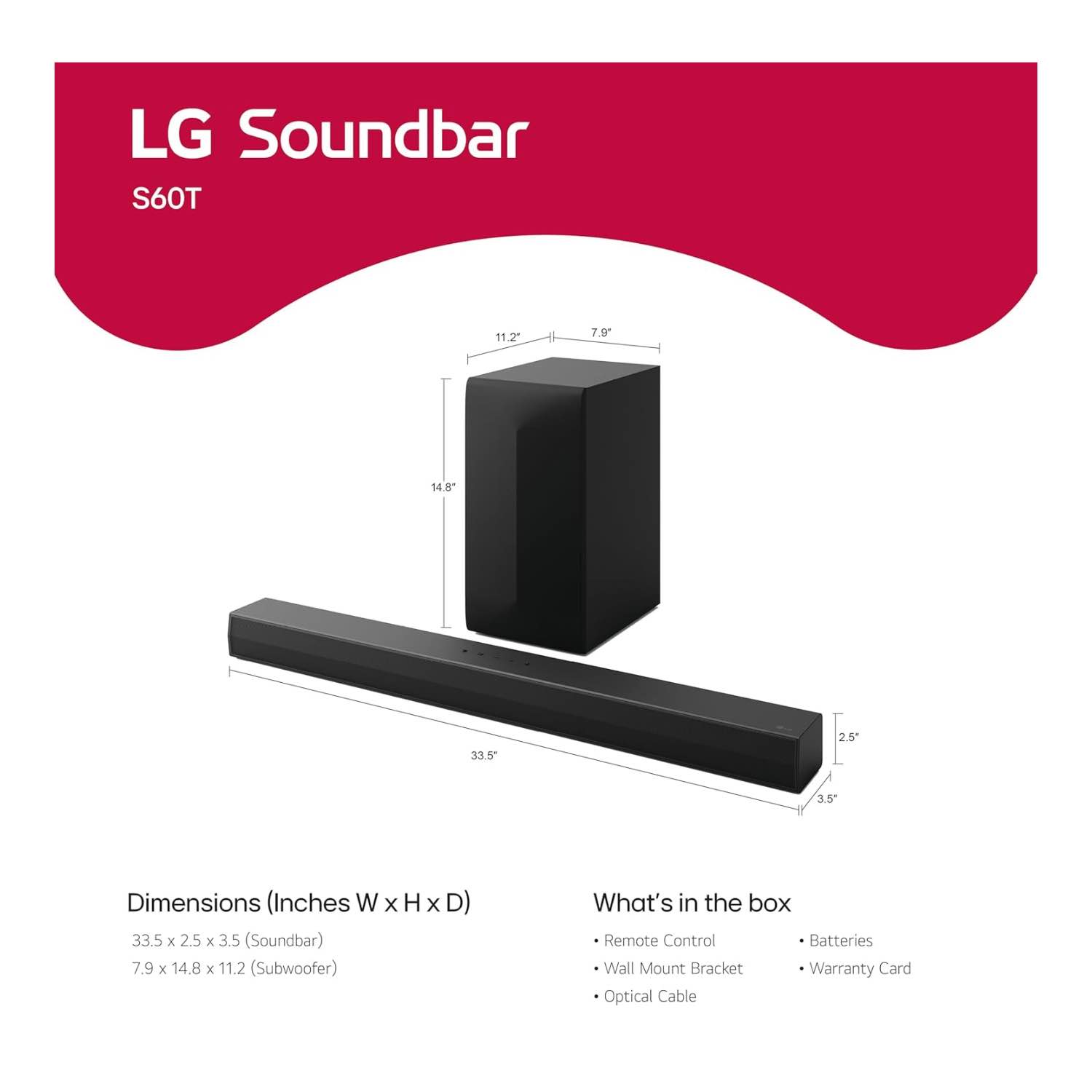 LG S60T 3.1ch Soundbar with Wireless Subwoofer (2024 Model)