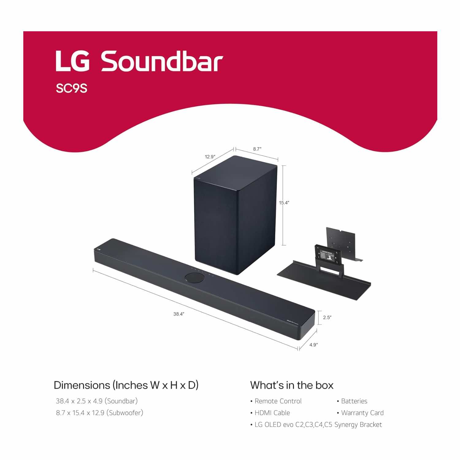 Bring cinematic sound to your living room with the LG SC9S, a premium 3.1.3-channel soundbar crafted to perfectly match the LG OLED evo C Series TV. With Dolby Atmos, wireless subwoofer, and seamless WOW integration, it delivers breathtaking audio that fills your space with rich, dynamic detail—turning every movie, game, or playlist into a powerful immersive experience.