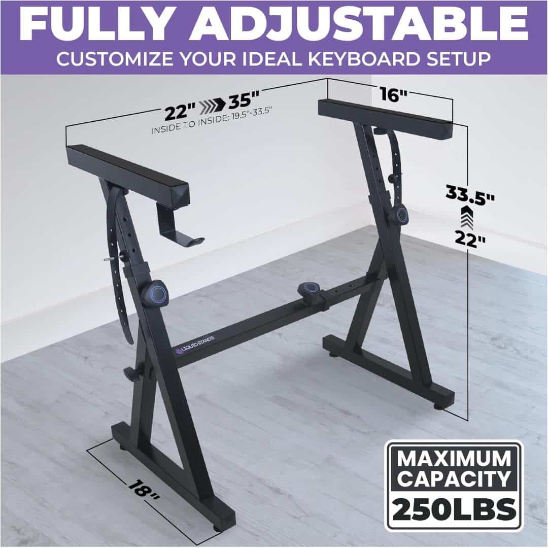 The Liquid Stands Z-Style Piano Keyboard Stand is a heavy-duty, adjustable, and portable stand designed to fit 54โ€“88 key keyboards, electric pianos, turntables, and other equipment. Its Z-shape frame provides maximum stability and supports instruments weighing up to 250 pounds. The standโ€™s adjustable height and width make it suitable for both seated and standing play, ensuring comfort and flexibility for musicians of all levels. With included accessories like anchoring straps and a headphone hook, this stand is ideal for home practice, studio setups, or live performances.