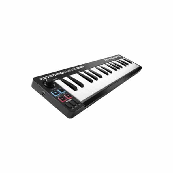 The Keystation Mini 32 II from M-Audio is a MIDI keyboard controller designed for sequencing music and playing virtual instruments on a Mac or Windows computer. It features 32 velocity-sensitive mini-size keys and a series of controls that expand the range of playable notes, with onboard octave buttons providing access to the full melodic keyboard range, so you may play bass lines, piano harmony, and lead melodies. You’ll also note the prominent volume knob for smooth crescendos, and a sustain button for sustaining single-handed chords or harmonic clusters.