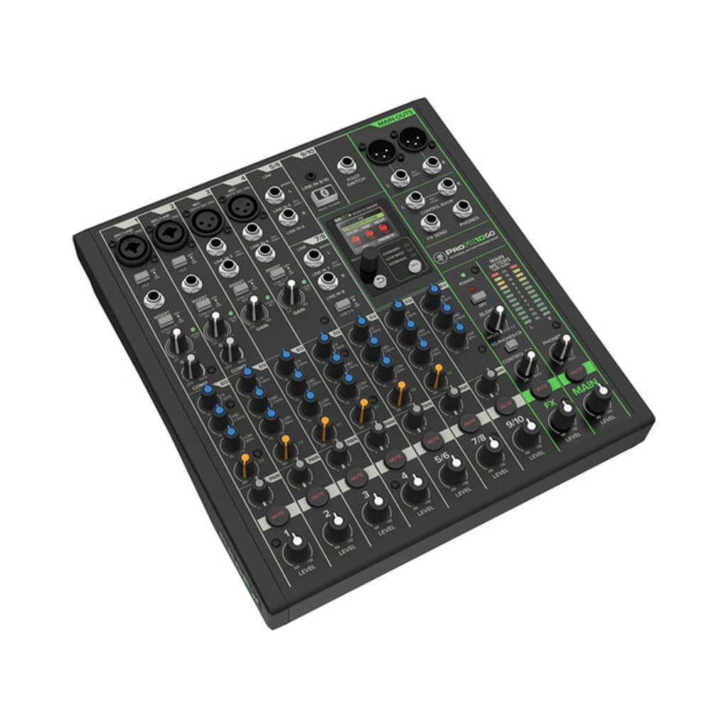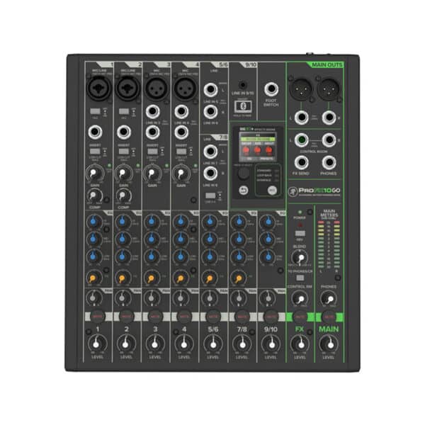 Save the day when power is out of your reach with the ProFX10 GO from Mackie, a 10-channel portable analog mixer with integrated USB-C audio interface and a rechargeable 8-hour battery. Loaded with four Onyx mic pres and all the features you’d expect from a Mackie board, this mixer is a vital tool for live mixing applications.Each Onyx mic pre offers up to 60 dB of clean gain. The mixer provides two XLR-1/4″ combo mic / line / Hi-Z inputs, two XLR 3-pin inputs, four 1/4″ TRS inserts, and stereo line inputs on channels 5 to 10. Each channel provides 3-band EQ control, mute, gain, level, and pan. Channels 1 to 8 offer FX return control, while channels 1 and 2 sport one-knob compression. With the clear, full-color LCD screen, you can browse through numerous GigFX+ digital effects and customize them to your heart’s content. Two-way Bluetooth communication, 2×4 USB interface duties, and mix minus functionality round out the features for an incredibly versatile mixing board that can handle DJ events, live streams, and venue backlines with ease.