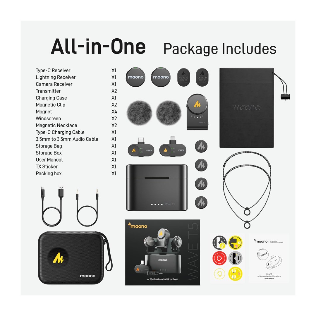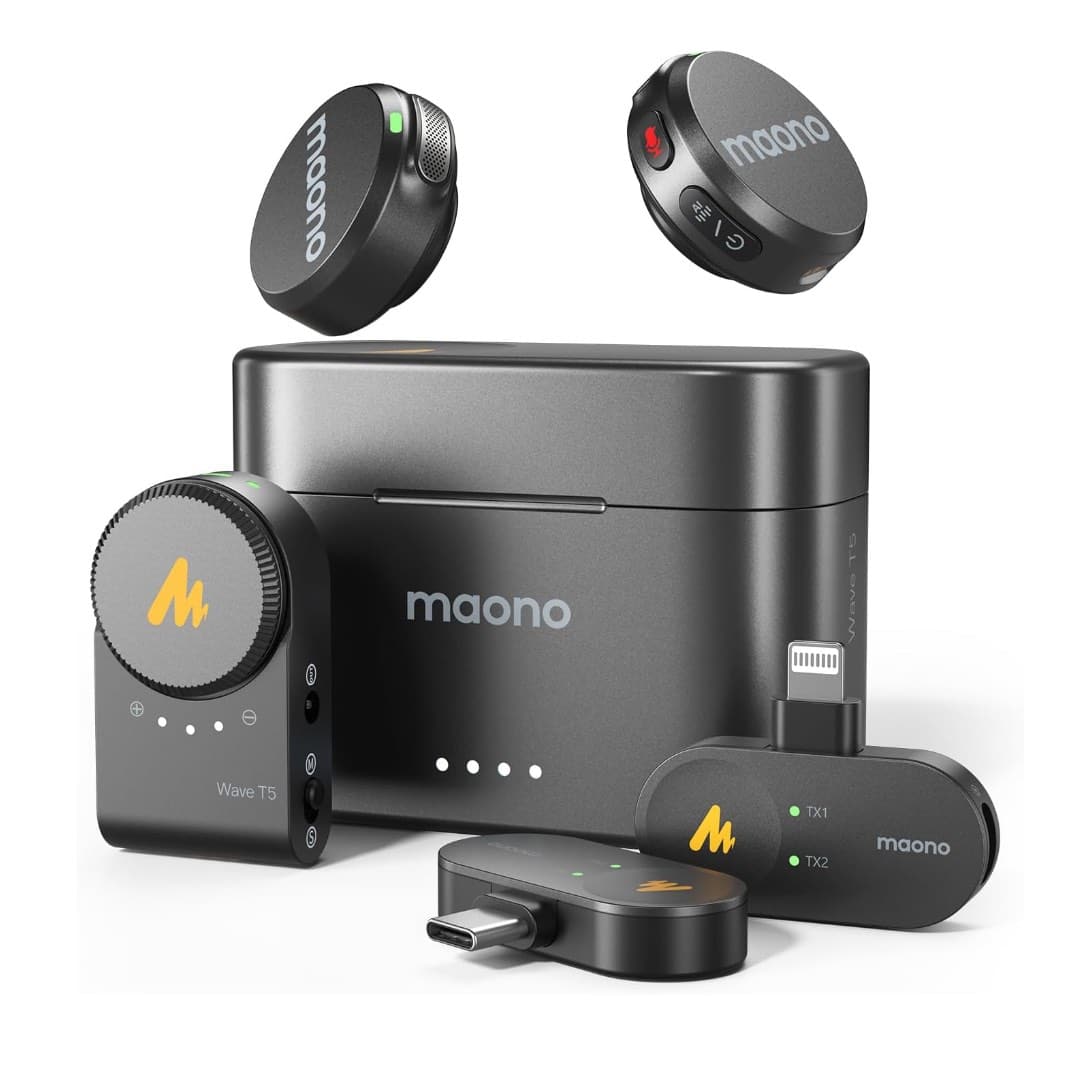 Capture crystal-clear audio anywhere with the MAONO Wave T5 wireless lavalier microphone. Designed for creators and professionals, it delivers studio-quality sound with long battery life and versatile device compatibility.