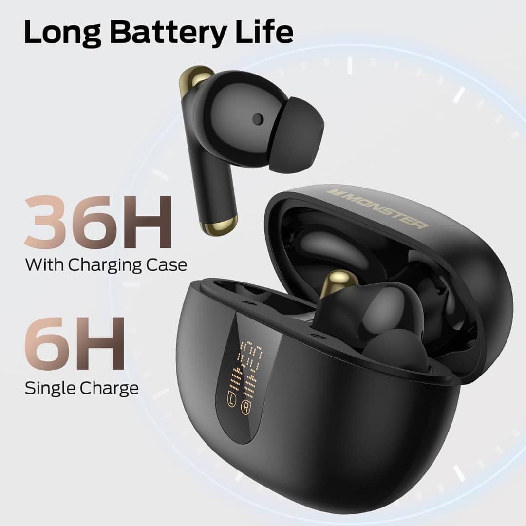 The included charging case with LED power display provides up to 36 hours of total playtime, keeping your earbuds powered throughout the day. Designed with water resistance, the Monster w39 earbuds are a reliable choice for workouts, outdoor activities, and on-the-go lifestyles.