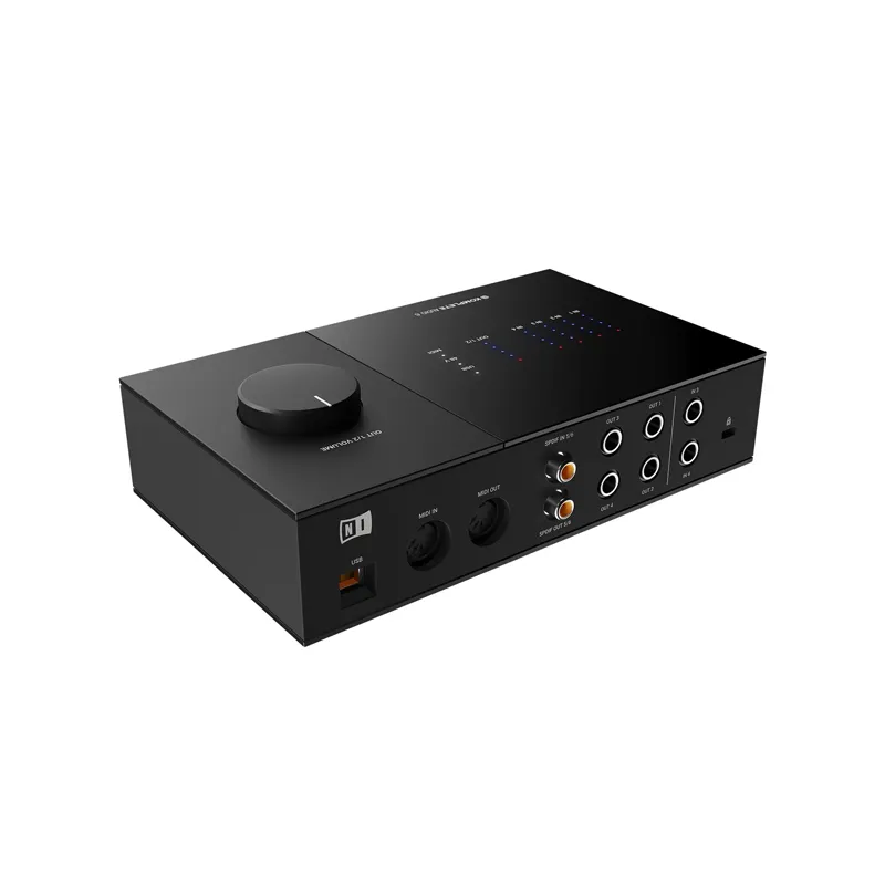 Four DC-coupled 1/4โณ outputs are on hand to accommodate connecting monitors or CV-controllable synthesizers. Dedicated level controls for outputs 1-2 and the two headphone jacks enable convenient listening through your favorite active speakers and stereo headphones. The direct monitoring function utilizes a mix knob to allow zero-latency monitoring during recording, a custom blend of input and playback signals for overdubbing, or monitoring just the playback for mixing. The direct monitoring section also has switches for mono/stereo mode and source selection.The USB 2.0 bus-powered KOMPLETE AUDIO 6 Mk2 is compatible with macOS and Windows 10 systems, and includes a robust software collection with instruments, effects, samples, loops, production apps, and more.