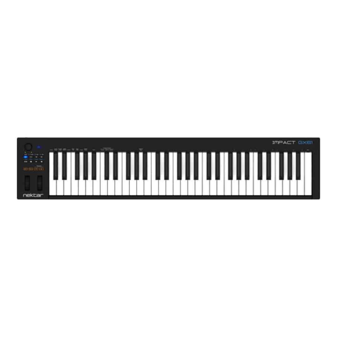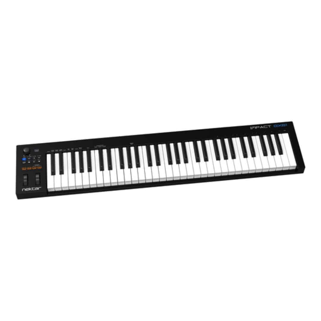 The GX61 from Nektar is 61-key USB MIDI keyboard controller featuring a pitch-bend wheel, modulation wheel, and footswitch socket. Two multi-colored octave buttons enable shifting the keyboard range by -3 or +4 octaves, with the LED colors showing exact status. Dedicated transpose buttons allow for shifting the keyboard range by +/- 12 semitones. The buttons can quickly be re-purposed to change the global MIDI channel, or send program messages. Additionally an assignable potentiometer provides control over any MIDI parameter, which by default controls mixer volume.