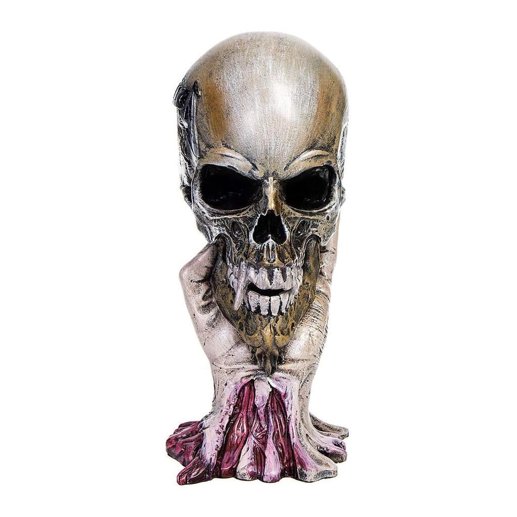 - Highly detailed fanged skull supported by a sculpted human hand base