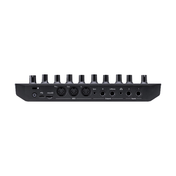 Connect to your studio with full-size five-pin MIDI in, out, and thru, and analog sync out. Mix and apply effects to two audio inputs, and listen through stereo out or with headphones.