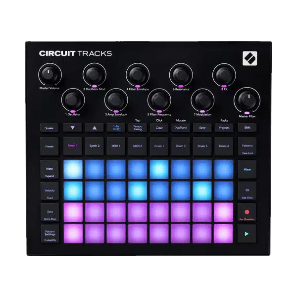 Electronic and dance music producers looking for a powerful, all-in-one groove box will be thrilled with the Novation Circuit Tracks, a compact and portable groove box that builds upon the success of the original Circuit and is designed to be used in the studio or on the go for professional producers and DJs. The machine offers two polyphonic digital synth engines, four sample-based drum tracks, and two MIDI tracks for sequencing and controlling external instruments.