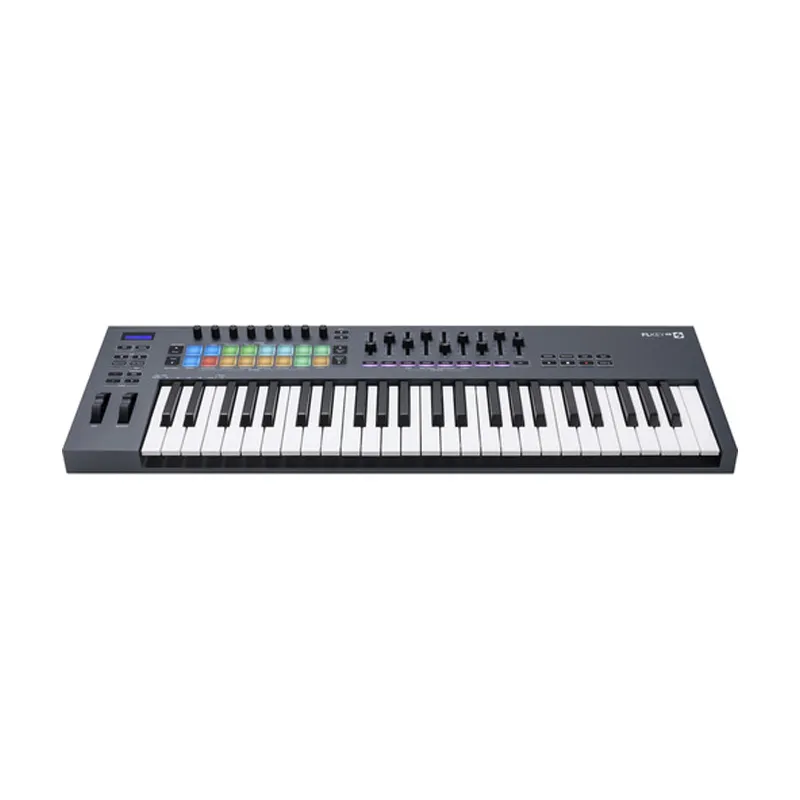 Music producers using FL Studio will be psyched for the Novation FLkey 49, a full-sized MIDI keyboard controller that provides complete hands-on control over your music production. With controls for FL Studioโs sequencer, channel rack, and mixer, plus creative scale and chord modes, the FLkey 49 will take your production to the next level. Sequencer mode maps the FLkey 49โs pads to FL Studioโs step sequencer for lightning-fast beat production. Two Pad modes provide realistic human feel to your rhythms. You can also play straight into the Channel Rack or FPC, and trigger slices in SliceX. With Note Repeat, you can generate crisp hi-hat rolls in record time.