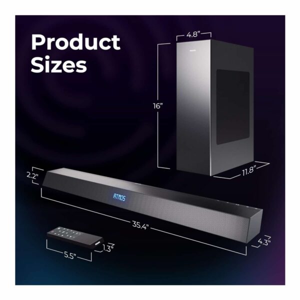 Experience cinema-like sound in your living room with the Philips 2.1 Channel Dolby Atmos Soundbar. Designed with immersive surround sound technology, powerful bass, and seamless wireless connectivity, this soundbar transforms your TV into a complete home theater system. Enjoy crystal-clear audio whether youโre watching movies, gaming, or streaming musicโall in a sleek, modern design that fits perfectly in any space.