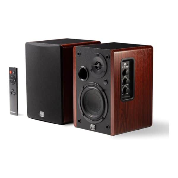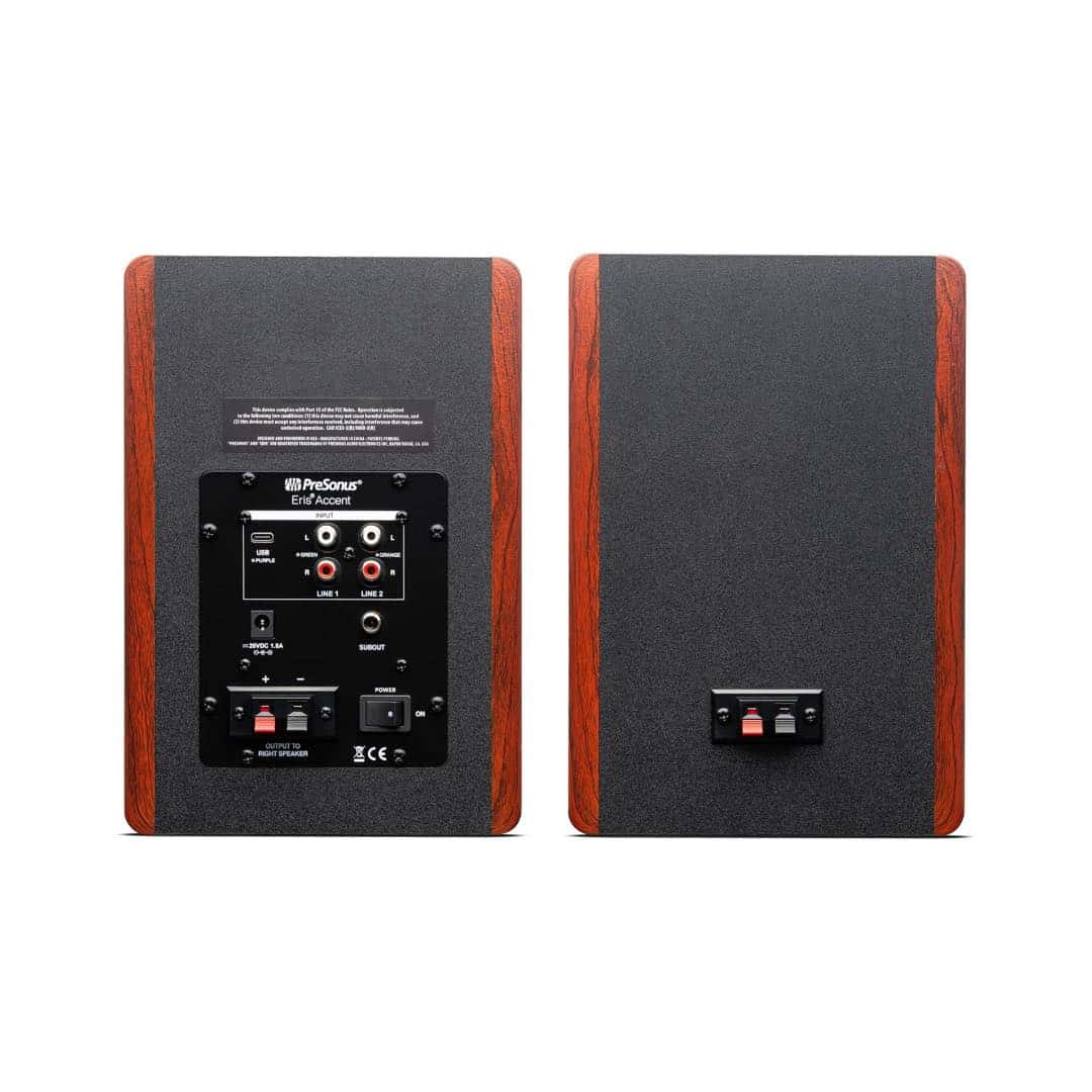 The PreSonus Eris Accent powered bookshelf speakers combine studio-quality sound with classic home audio style. Designed for music lovers, vinyl enthusiasts, and multimedia users, these compact speakers deliver powerful, high-fidelity audio with a clean, modern look.Featuring a 4-inch woofer and ยฝ-inch silk-dome tweeter, the Eris Accent offers a smooth, immersive listening experience with detailed highs, warm mids, and punchy bass. With 50 watts of total system power (25 watts per channel), theyโre ideal for turntables, desktop computers, home entertainment setups, and more.The elegant wood-grain finish adds a premium aesthetic that fits effortlessly into any room. Customizable bass, treble, and volume controls let you fine-tune your sound, while dual analog inputs (USB-C and RCA) offer flexible connectivity. A built-in subwoofer output gives you the option to expand your system for even deeper low-end.Whether you’re enjoying vinyl records, streaming from your computer, or watching movies, the Eris Accent speakers deliver a rich, full-range audio experienceโno software, no fuss.