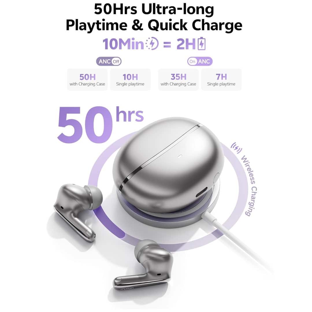 - Long Battery Life: Up to 10 hours per charge (normal mode) or 7 hours (ANC on); total playtime up to 50 hours with charging case.