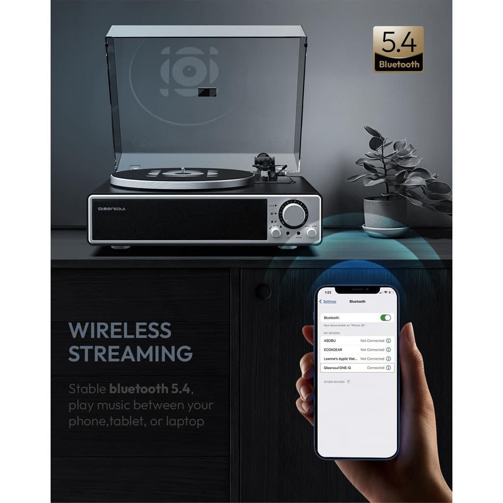 The ONE-Q Vinyl Record Player from Qlearsoul delivers a premium listening experience in a sleek, retro-modern design. With built-in speakers, Bluetooth 5.4 connectivity, and a high-quality AT-3600L magnetic cartridge, it blends classic analog warmth with modern convenience. Designed for both vinyl enthusiasts and beginners, itโ€™s an elegant centerpiece that offers high-fidelity sound and effortless operation.