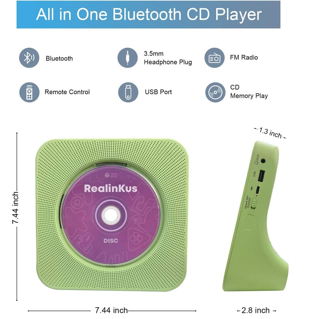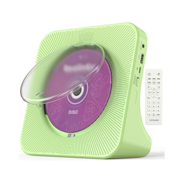 Desktop CD Player with Speakers, Bluetooth, FM Radio, Remote, USB/AUX, Wall-Mountable or Tabletop, AC Powered, Green