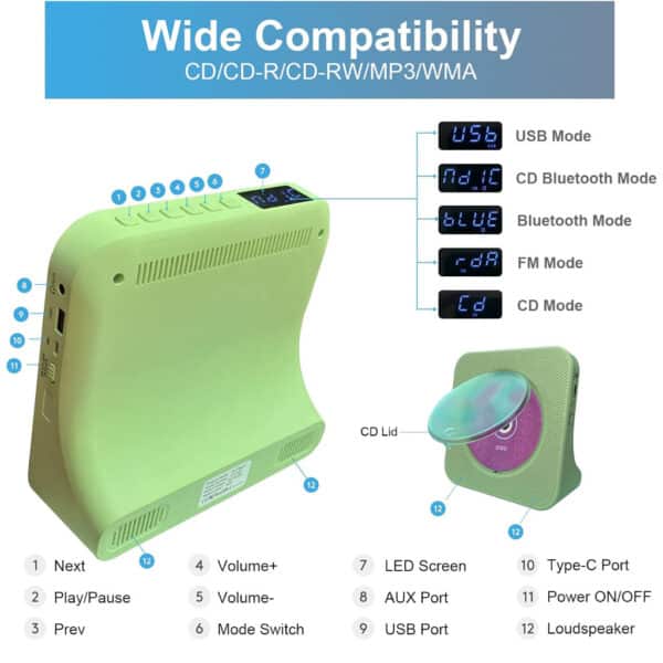 - All-in-One Music Solution: Supports CD, CD-R, CD-RW, MP3, and WMA formats, plus Bluetooth input/output, USB playback, FM radio, and AUX connections.