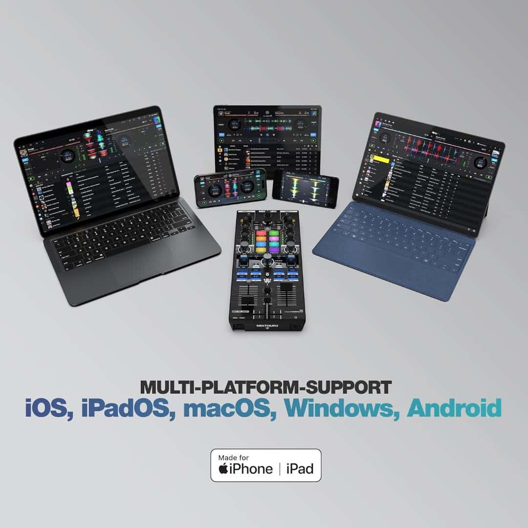High-quality, ultra-portable all-in-one four-deck DJ controller designed in collaboration with DJ & producer Laidback Luke. Built for clubs, festivals, and mobile setups, the Mixtour Pro delivers premium sound, low latency, and intuitive control in a compact, travel-friendly design.
