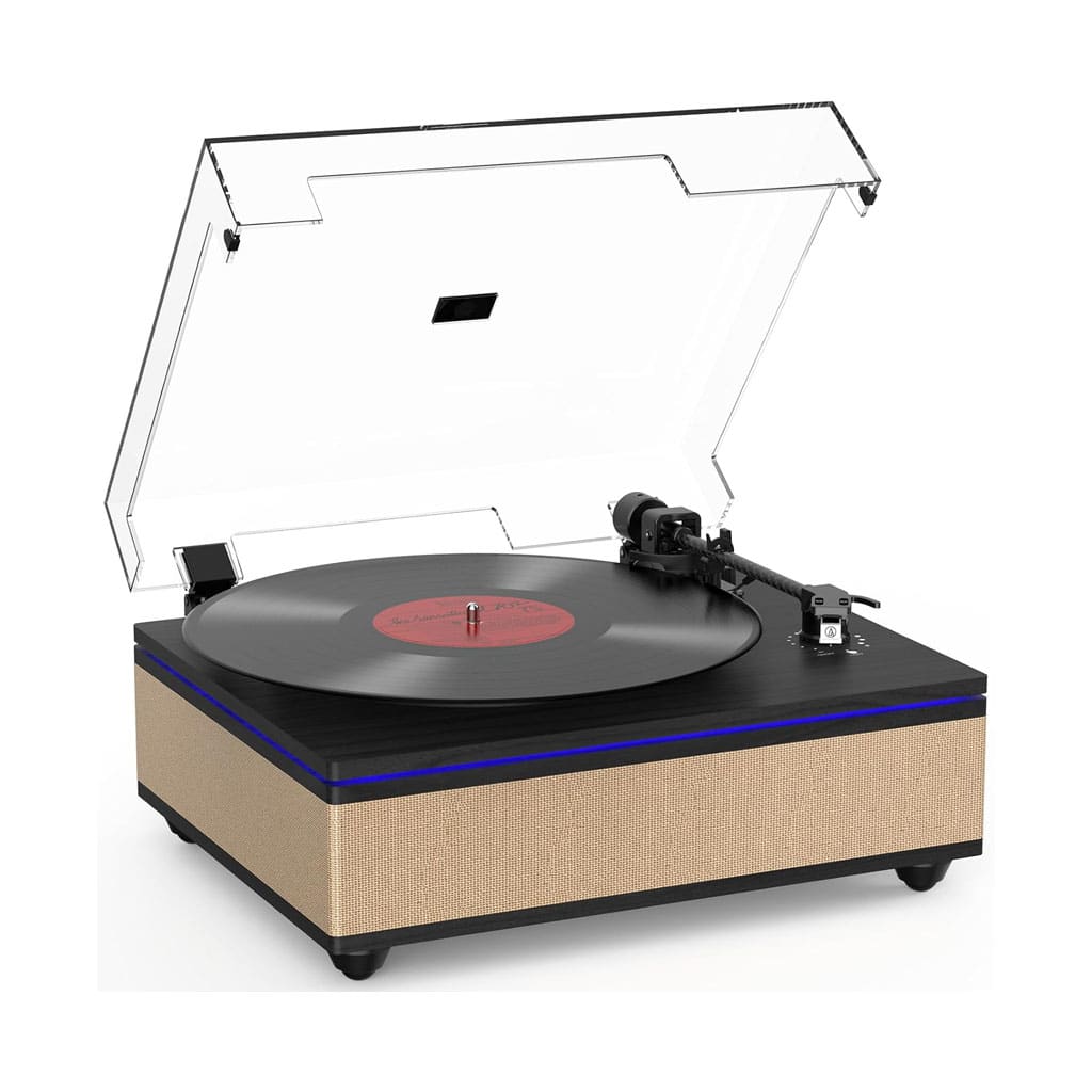 The RetroAudio Vinyl Record Player combines timeless aesthetics with modern technology for the perfect audio experience. Featuring built-in high-fidelity stereo speakers, a premium AT-3600L magnetic cartridge, and Bluetooth 5.3 wireless connectivity, it delivers warm, rich, and detailed sound whether youโre spinning vinyl or streaming music. The sleek black and gold design with ambient LED lighting adds a touch of elegance and modern flair to your home.