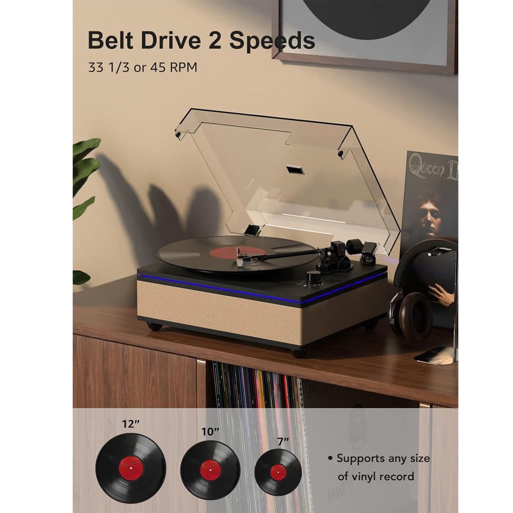 Belt-Drive System: Provides steady rotation and reduces vibration for smooth, consistent playback.