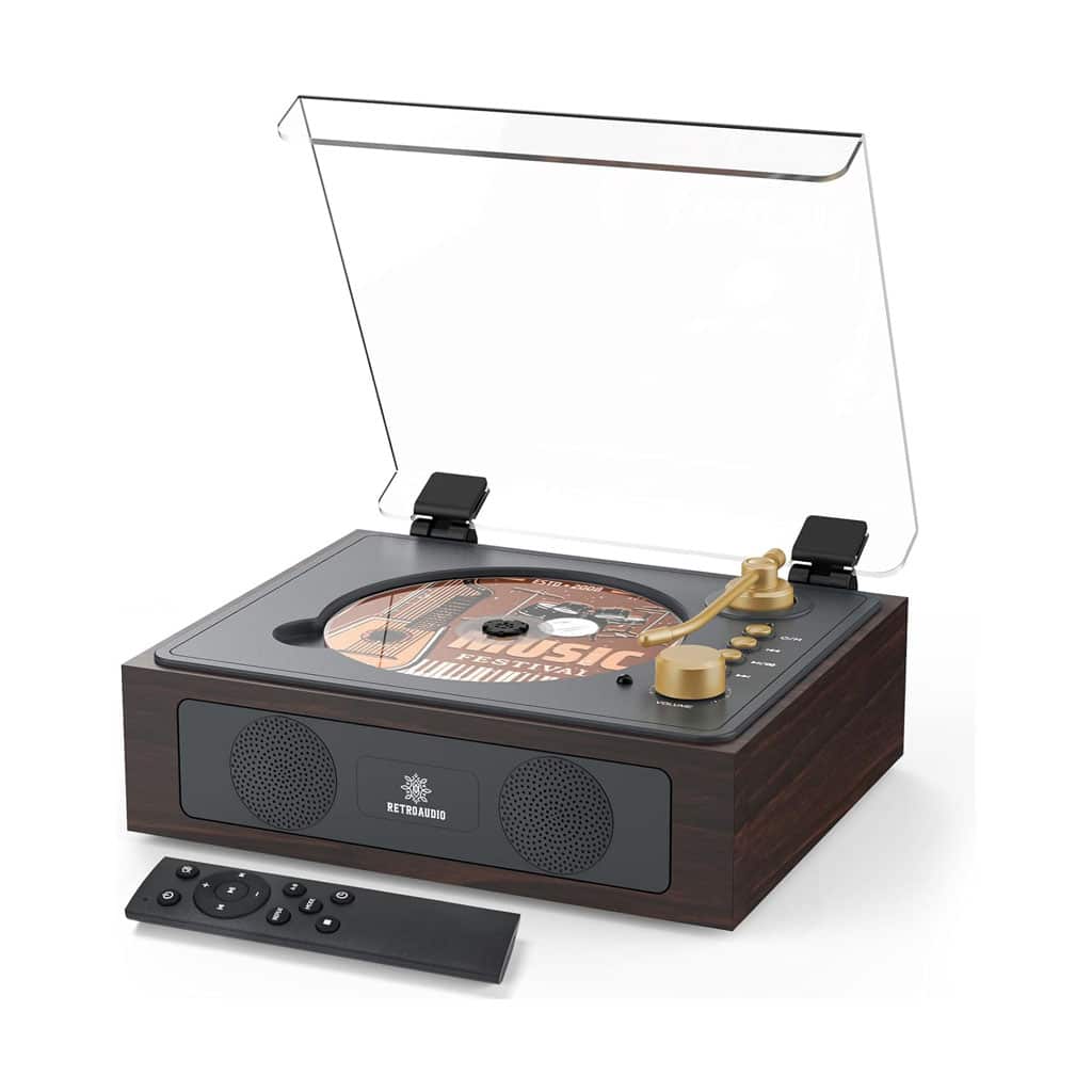 | Design | Retro-inspired turntable look with gold tonearm |
