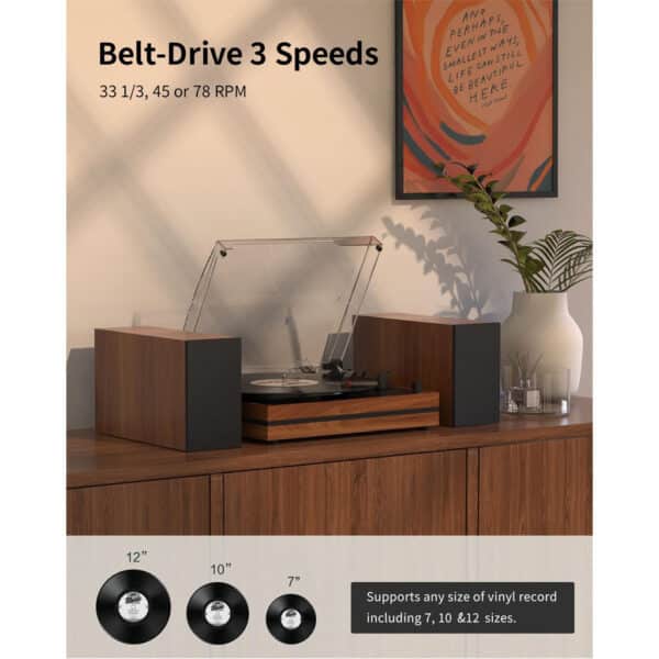 3-Speed Belt-Drive Turntable: Supports 33โ , 45, and 78 RPM for 7″, 10″, and 12″ vinyl records. Includes a 45 RPM adapter.