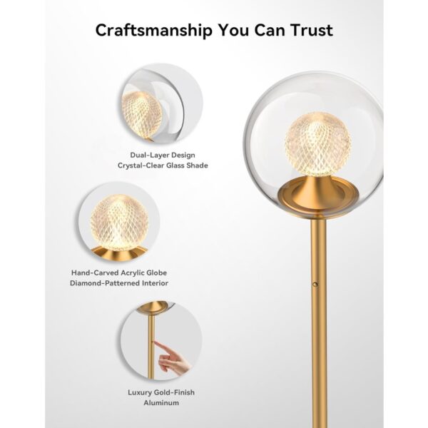 The Tubicen Gold Floor Lamp combines modern elegance with functional design, making it a stylish addition to any living room, bedroom, or office. Its dual-globe glass shade and diamond-patterned acrylic inner globe create a warm 360ยฐ glow that enhances the ambiance of any space. With a sleek gold finish, compact frame, and touch-sensitive controls, this lamp brings sophistication and convenience to both everyday living and special occasions.