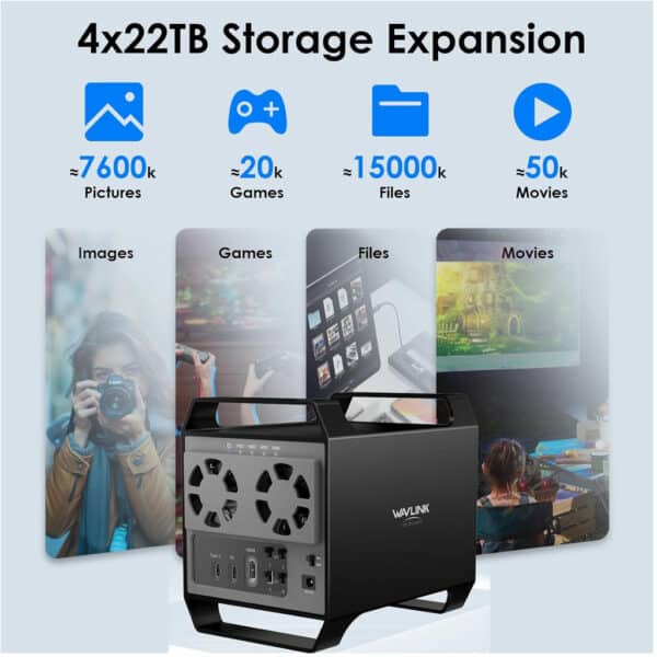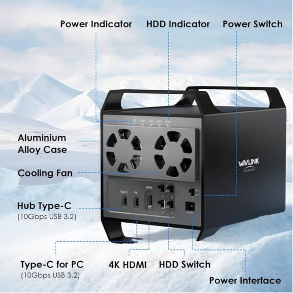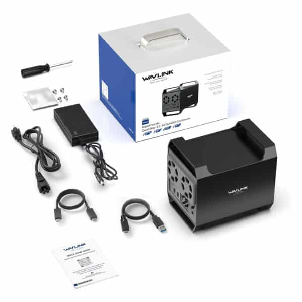 The WAVLINK 4-Bay Hard Drive Enclosure is a high-speed, multi-functional storage solution for professionals and power users. Supporting both 3.5″ and 2.5″ SATA HDDs and SSDs, it delivers up to 88TB total capacity and 10Gbps USB-C 3.2 transfer speeds. Designed with an aluminum body, dual cooling fans, and 4K HDMI video output, it combines performance, durability, and versatility in one compact unit.