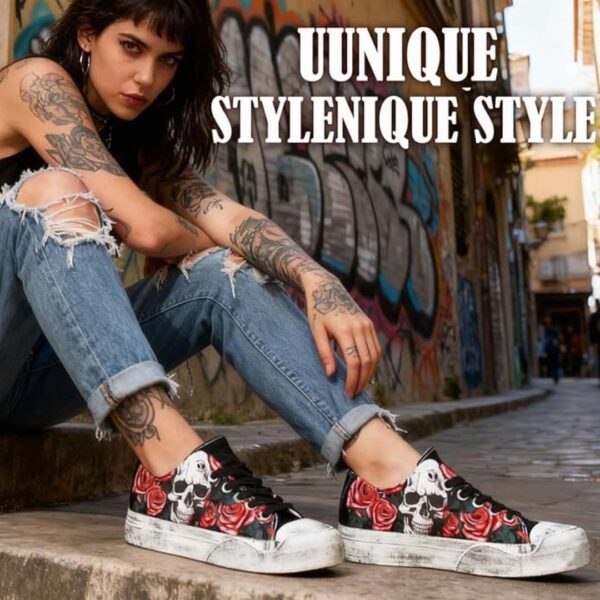 Stand out with these bold Gothic Skull Skeleton Canvas Sneakers, designed for anyone who loves retro punk streetwear with everyday comfort. Featuring striking skull and rose artwork in a black-and-red palette, these low-top sneakers blend edgy style with practical wearability. Whether youโre heading out for casual hangouts, street dancing, walking, or celebrating Halloween, these shoes add a rebellious flair to any outfit. The lightweight canvas upper and durable rubber sole make them suitable for daily wear while keeping your look unique and expressive.