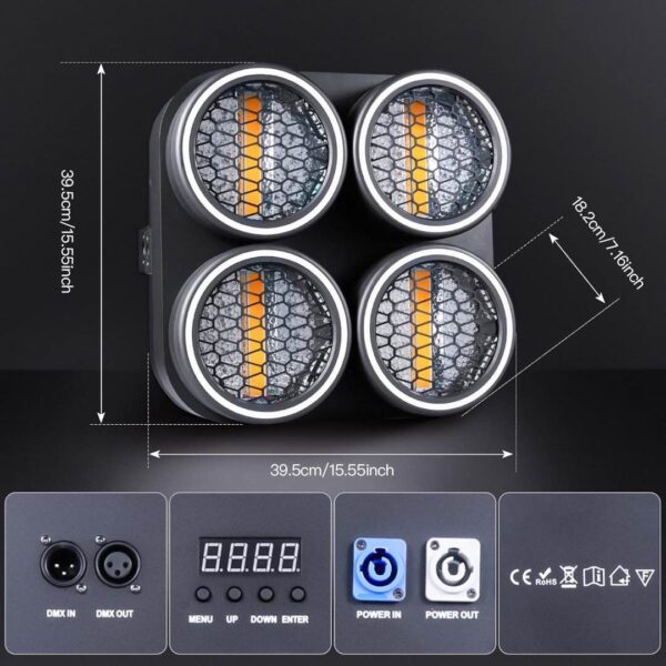 - 4-eye light source with 4ร50W COB golden LEDs, 4รSMD5050 RGB lights, and 124ร0.2W RGB halo LEDs for stunning wash and color effects