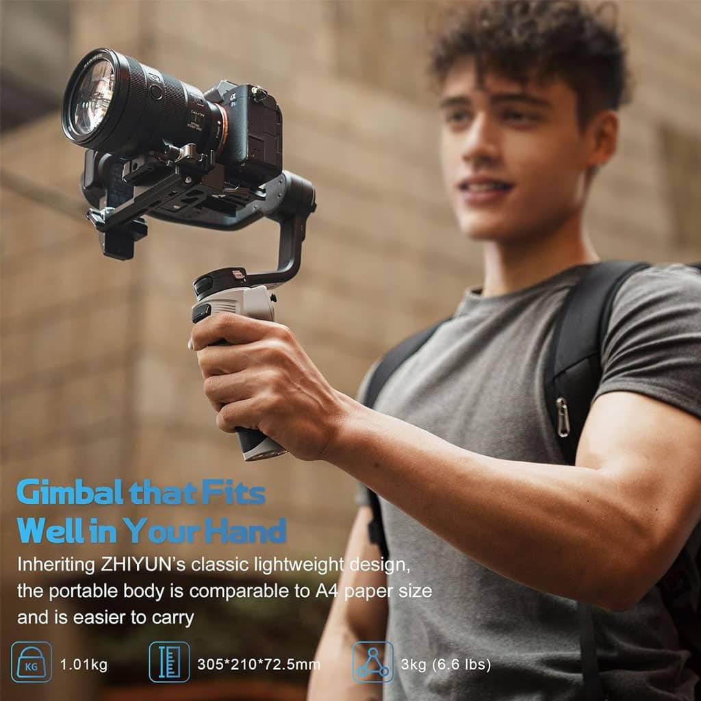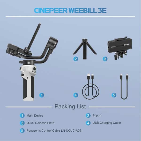 The ZHIYUN CINEPEER WEEBILL 3E is a compact yet powerful 3-axis gimbal designed for cameras from Canon, Sony, Panasonic, and Nikon. With up to a 3kg payload, it offers native vertical shooting, advanced stabilization, and wireless Bluetooth controlโall in a lightweight, portable body built for long filming sessions.