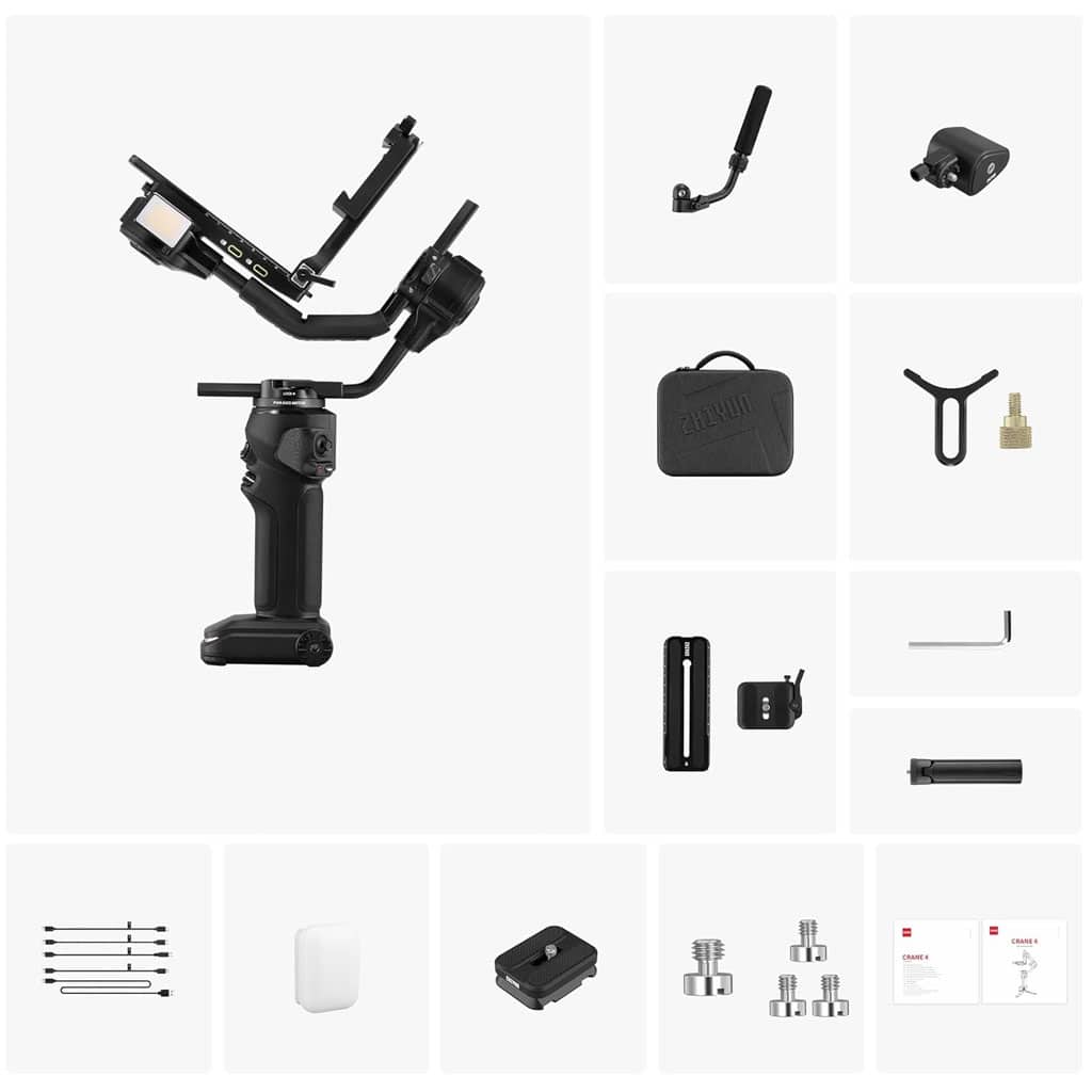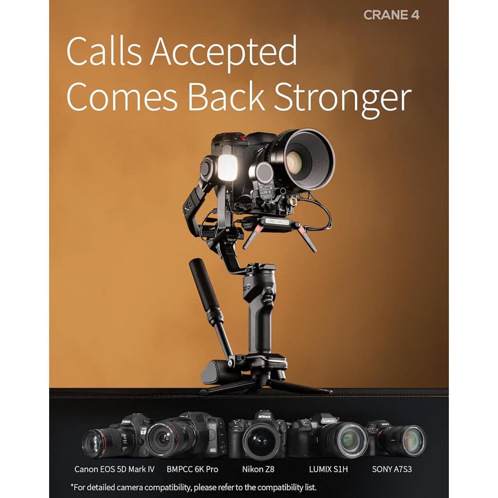 The ZHIYUN Crane 4 Combo is a professional 3-axis gimbal designed for full-frame DSLR and mirrorless cameras. With powerful motors, extended arm length, and advanced stabilization, it delivers flawless, cinematic footage. Its built-in fill light, Bluetooth control, and ergonomic sling grip make it ideal for creators seeking precision, comfort, and versatility.